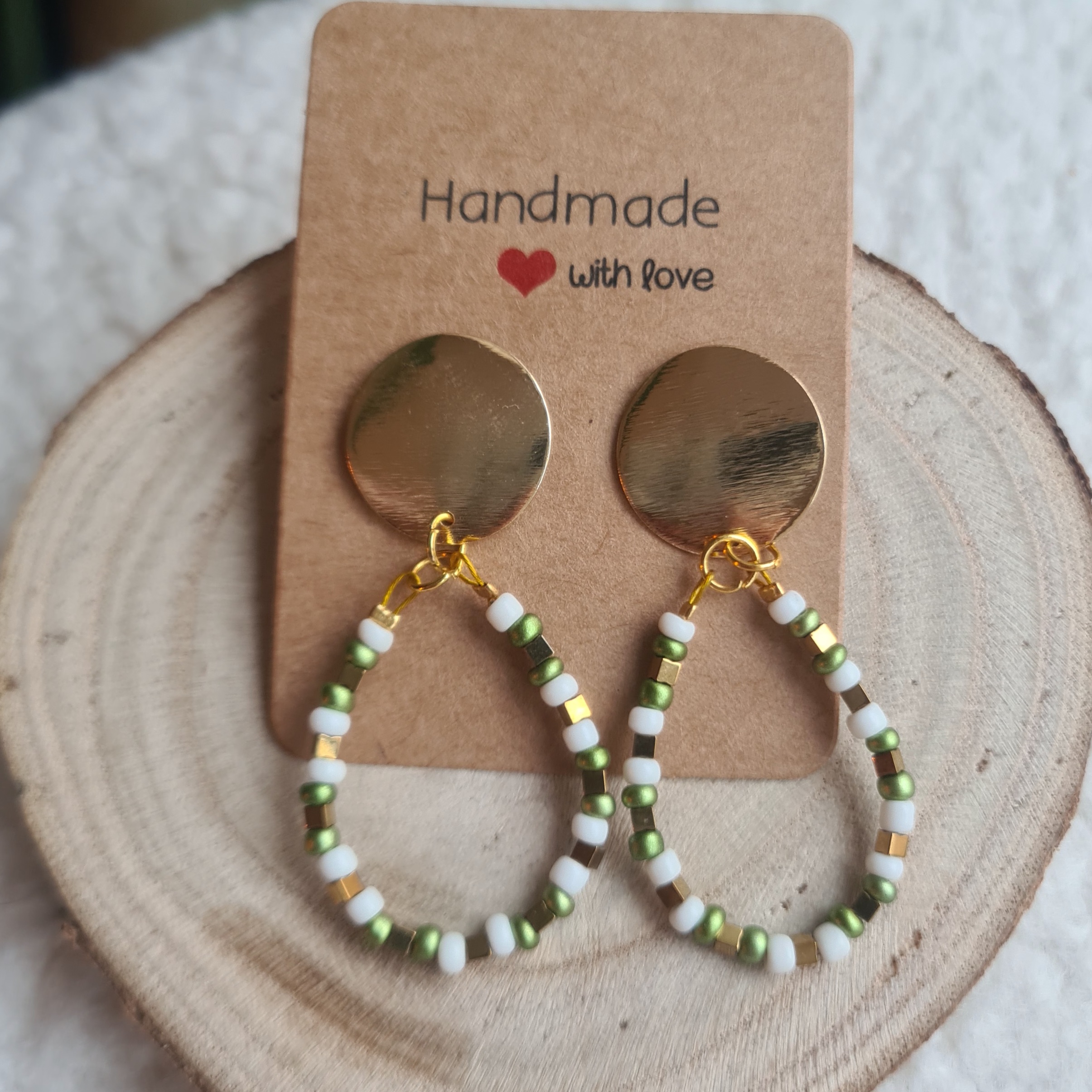 Rondgebogen ovaal met glaskraaltje in witte en groene kleuren aan een grote gouden (RVS) steker,