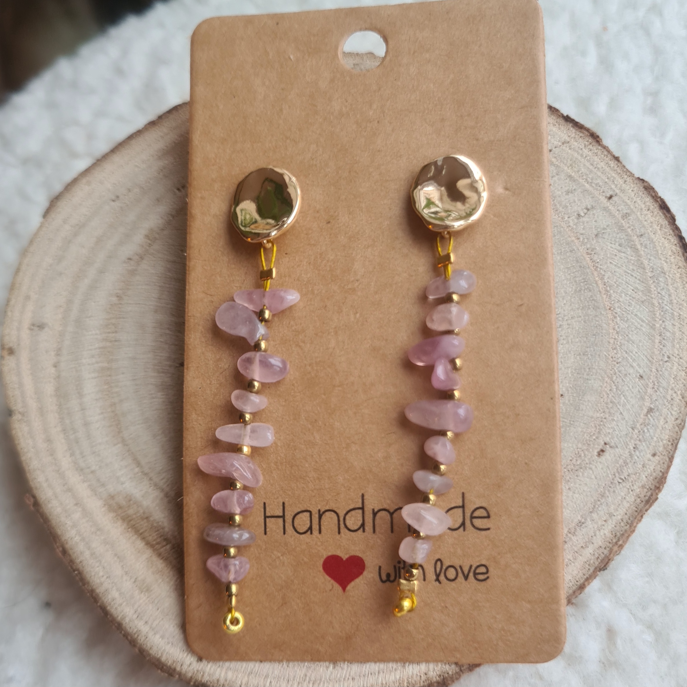 Prachtige lange oorbellen bestaande uit rosequarz kraaltjes aan prachtige goudkleurige stekertjes (RVS).